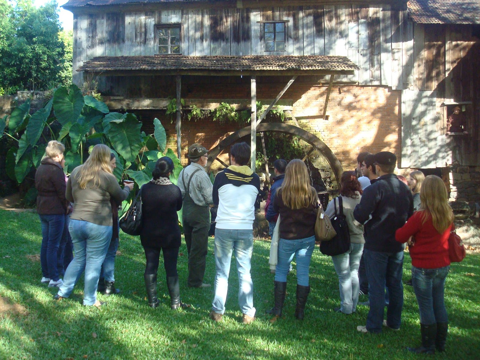 Seguimos até o Moinho e Serraria Hillebrand, em Linha Imperial. A recepção foi com música alemã e Cláudio Hillebrand e sua família nos acolheram. Ele nos explicou como funcionam os dois empreendimentos. O moinho de água, que produzia farinha de milho, trigo e centeio. A serraria fica no mesmo galpão do moinho. Os equipamentos ainda funcionam, embora tenham encerrado as atividades em 2011.